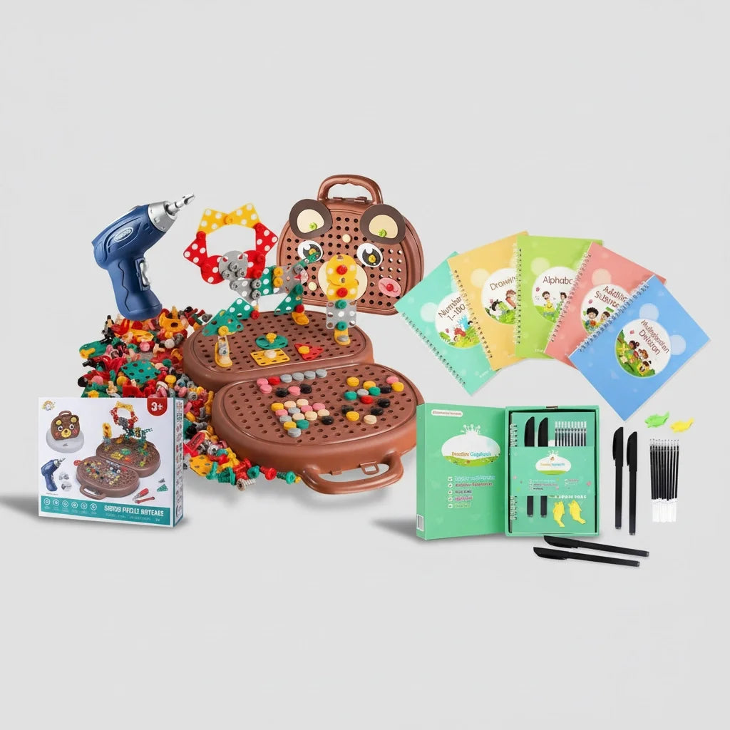 Pachetul Creatorului (3+) aduce împreună două dintre cele mai apreciate activități educative: Puzzle-ul Creativ cu Mini Bormașină (203 piese) și Setul de 5 Caiete Caligrafice Reutilizabile.